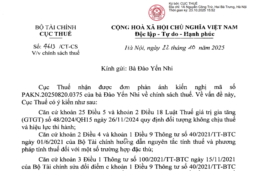Câu hỏi: Kính gửi: Bộ Tài Chính-Tổng Cục Thuế Công ty Cổ phần Đầu Tư Xây Dựng Trung Nam MST: 0303543710 Địa chỉ: 7A/68 Thành Thái, Phường 14, Quận 10,...