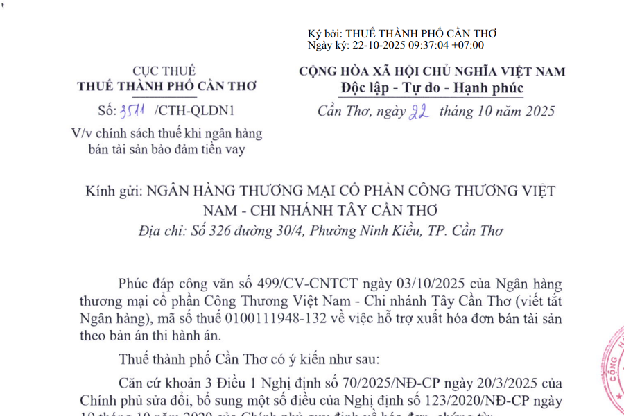 CỤC THUẾ THUẾ THÀNH PHỐ CẦN THƠ Số: 3511/CTH-QLDN1V/v chính sách thuế khi ngân hàng bán tài sản bảo đảm tiền vay CỘNG HÒA XÃ HỘI CHỦ NGHĨA VIỆT NAM...