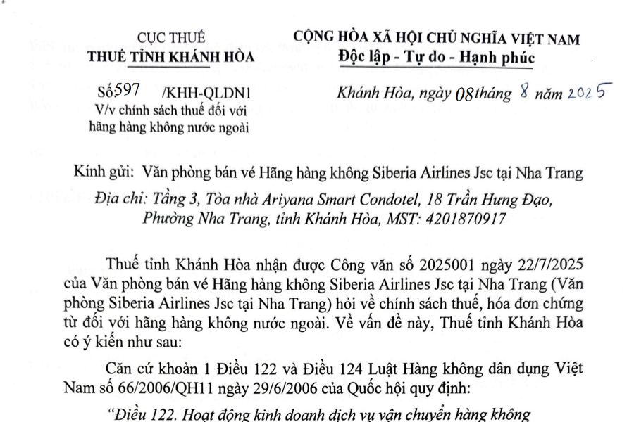 CỤC THUẾ THUẾ TỈNH KHÁNH HÒA Số: 597 /KHH-QLDN1 V/v chính sách thuế đối với hãng hàng không nước ngoài CỘNG HÒA XÃ HỘI CHỦ NGHĨA VIỆT NAM Độc lập...