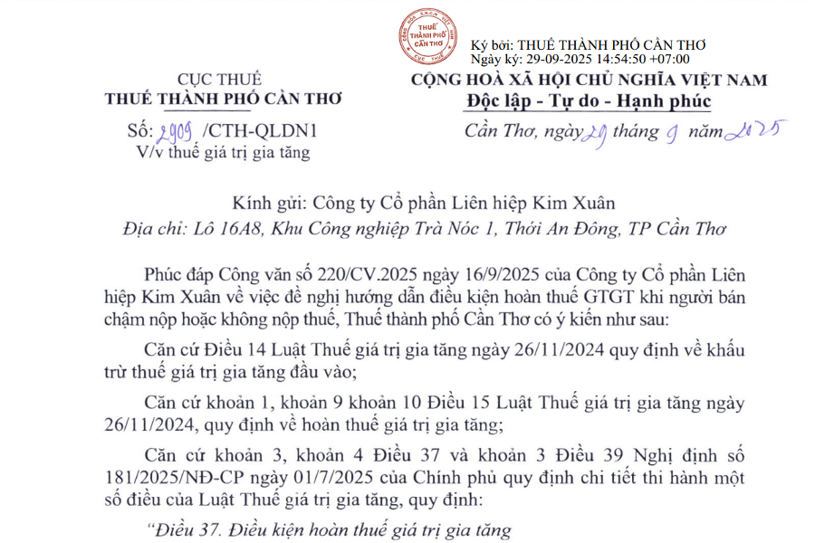 CỤC THUẾ THUẾ THÀNH PHỐ CẦN THƠ Số 2909/CTH-QLDN1 V/v thuế giá trị gia tăng CỘNG HÒA XÃ HỘI CHỦ NGHĨA VIỆT NAM Độc lập – Tự do – Hạnh...