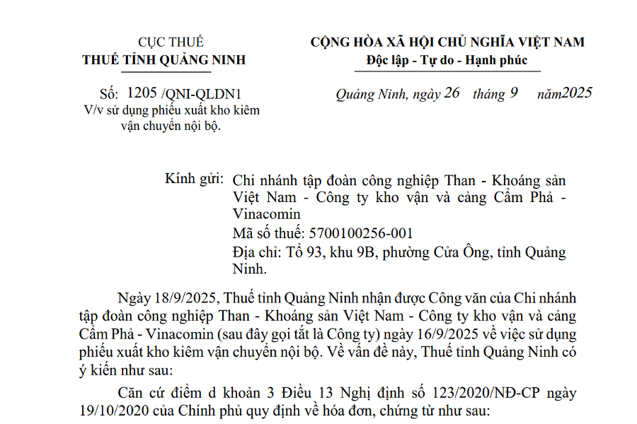 CỤC THUẾ THUẾ TỈNH QUẢNG NINH Số: 1205 /QNI-QLDN1 V/v sử dụng phiếu xuất kho kiêm vận chuyển nội bộ. CỘNG HÒA XÃ HỘI CHỦ NGHĨA VIỆT NAM Độc lập...