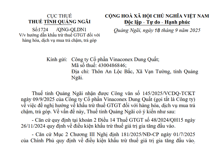 CỤC THUẾ THUẾ TỈNH QUẢNG NGÃI Số:1724 /QNG-QLDN1 V/v hướng dẫn khấu trừ thuế GTGT đối với hàng hóa, dịch vụ mua trả chậm, trả góp CỘNG HOÀ XÃ HỘI...