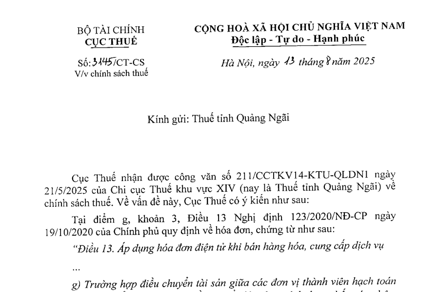 Công văn 3145 Về việc chi nhánh giải thể không xuất hóa đơn cho địa điểm kinh doanh