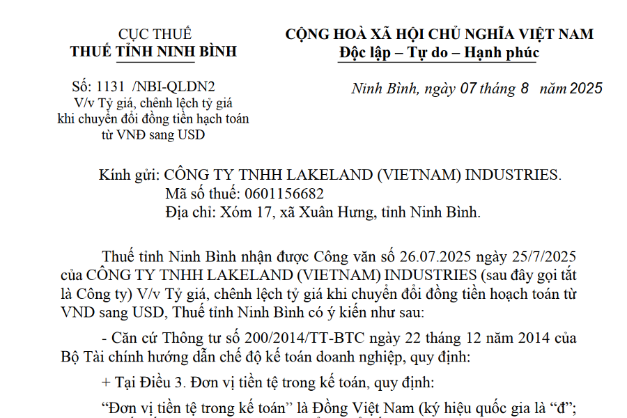 Công văn 1131 Về tỷ giá khi chuyển đổi đồng tiền hạch toán từ VND sang USD