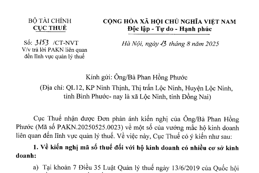 Công văn 3153 Về quản lý thuế hộ kinh doanh và quản lý hóa đơn của hộ kinh doanh