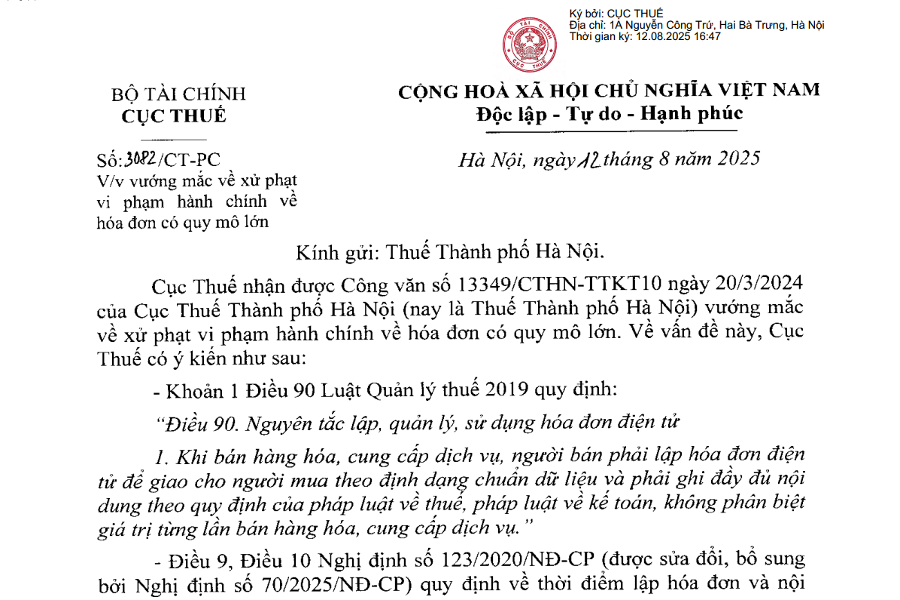 BỘ TÀI CHÍNH CỤC THUẾSố: 3082/CT-PC V/v vướng mắc về xử phạt vi phạm hành chính về hóa đơn có quy mô lớn CỘNG HOÀ XÃ HỘI CHỦ NGHĨA VIỆT...