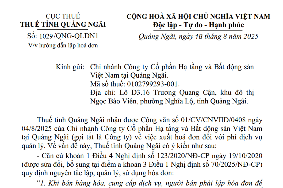 CỤC THUẾ THUẾ TỈNH QUẢNG NGÃI Số: 1029/QNG-QLDN1 V/v hướng dẫn lập hoá đơn CỘNG HOÀ XÃ HỘI CHỦ NGHĨA VIỆT NAM Độc lập – Tự do – Hạnh phúc...