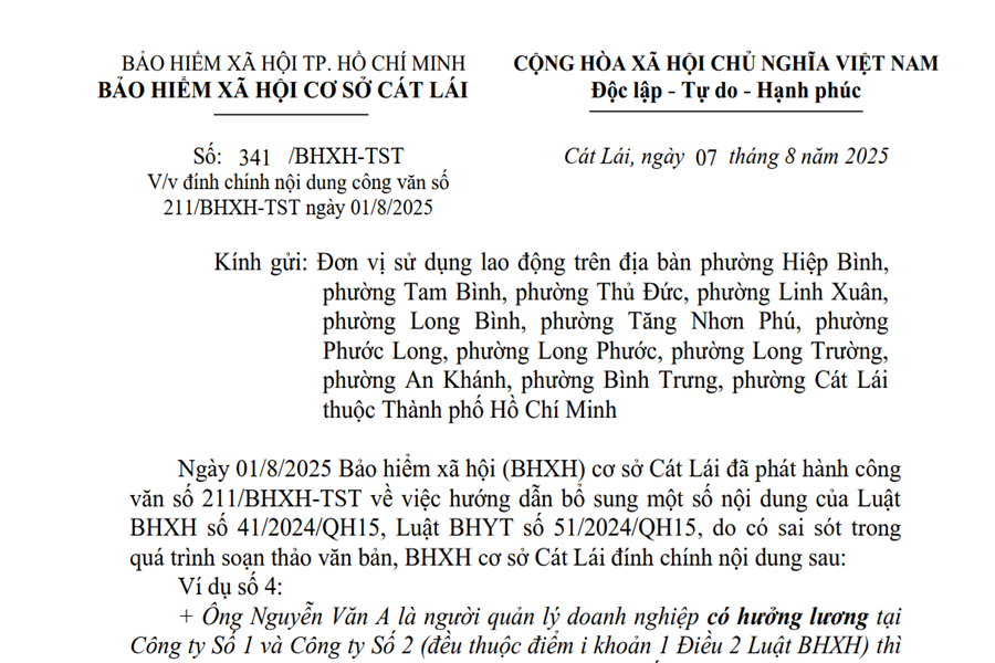 BẢO HIỂM XÃ HỘI TP. HỒ CHÍ MINH BẢO HIỂM XÃ HỘI CƠ SỞ CÁT LÁI Số: 341 /BHXH-TST V/v đính chính nội dung công văn số 211/BHXH-TST ngày 01/8/2025...