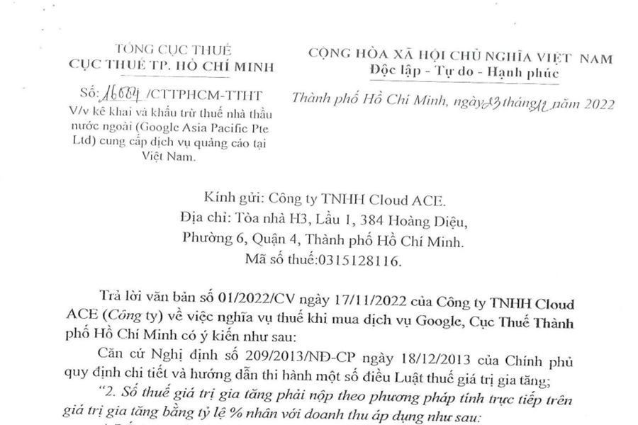 Công văn 16004 Hướng dẫn kê khai và khấu trừ thuế nhà thầu nước ngoài của dịch vụ quảng cáo Google