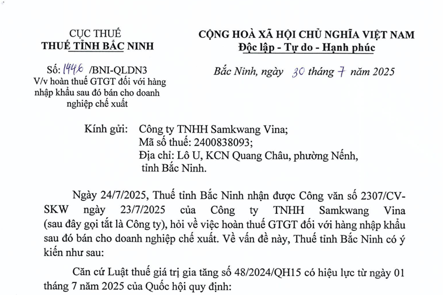 CỤC THUẾ THUẾ TỈNH BẮC NINH Số: 1446 /BNI-QLDN3 V/v hoàn thuế GTGT đối với hàng nhập khẩu sau đó bán cho doanh nghiệp chế xuất CỘNG HOÀ XÃ HỘI...