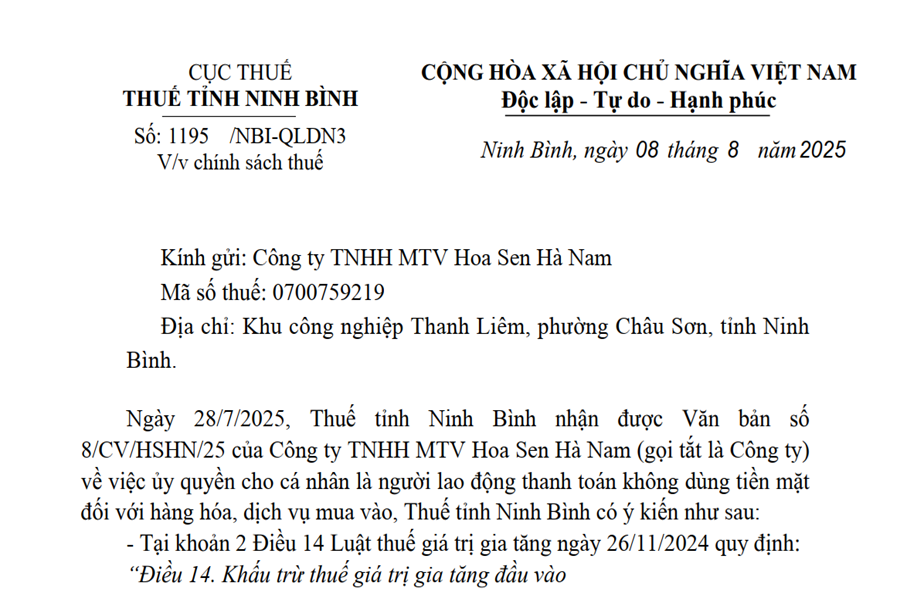 CỤC THUẾ THUẾ TỈNH NINH BÌNH Số: 1195 /NBI-QLDN3 V/v chính sách thuế CỘNG HÒA XÃ HỘI CHỦ NGHĨA VIỆT NAM Độc lập – Tự do – Hạnh phúc ——-...
