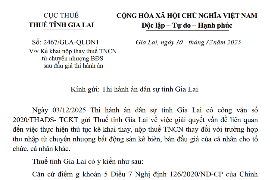 Công văn 2467 hướng dẫn kê khai thuế khi thi hành án