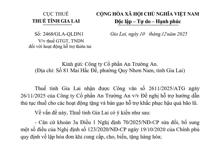 CỤC THUẾ THUẾ TỈNH GIA LAI Số: 2468/GLA-QLDN1 V/v thuế GTGT, TNDN đối với hoạt động hỗ trợ thiên tai CỘNG HÒA XÃ HỘI CHỦ NGHĨA VIỆT NAM Độc lập...