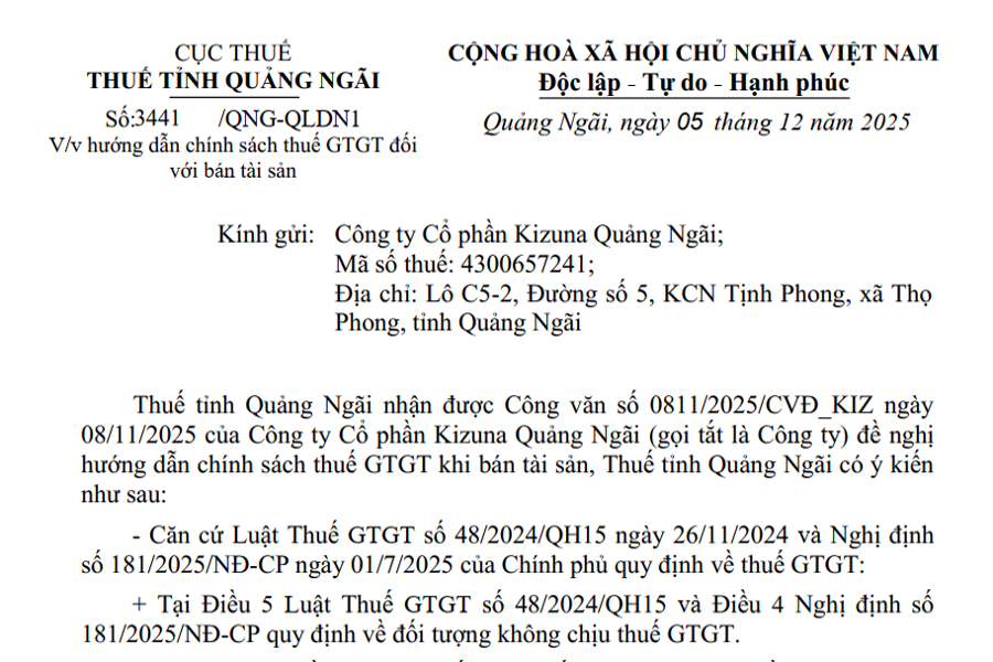 CỤC THUẾ THUẾ TỈNH QUẢNG NGÃI Số:3441 /QNG-QLDN1 V/v hướng dẫn chính sách thuế GTGT đối với bán tài sản CỘNG HÒA XÃ HỘI CHỦ NGHĨA VIỆT NAM Độc lập...