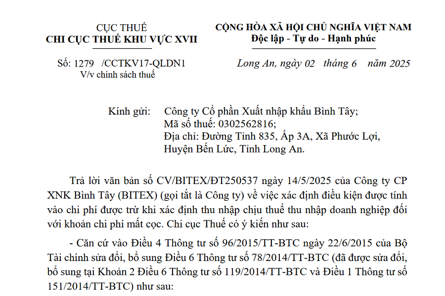 CỤC THUẾ CHI CỤC THUẾ KHU VỰC XVII Số 1279/CCTKV17-QLDN1 V/v chính sách thuế CỘNG HÒA XÃ HỘI CHỦ NGHĨA VIỆT NAM Độc lập – Tự do – Hạnh phúc...
