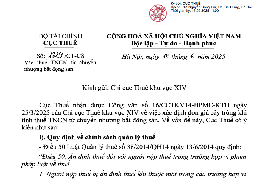 Công văn 1829 Về thuế TNCN từ chuyển nhượng bất động sản