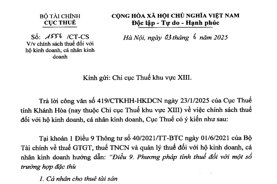 Công văn 1556 Về thuế suất hộ kinh doanh cá nhân kinh doanh cho thuê tài sản kèm theo dịch vụ