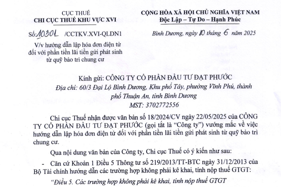 Công văn 10301 Hướng dẫn lập hóa đơn điện tử đối với lãi tiền gửi phát sinh từ quỹ bảo trì chung cư
