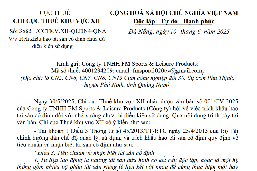 CỤC THUẾ CHI CỤC THUẾ KHU VỰC XII Số: 3883 /CCTKV.XII-QLDN4-QNA V/v trích khấu hao tài sản cố định chưa đủ điều kiện sử dụng CỘNG HOÀ XÃ HỘI CHỦ...