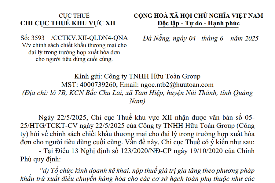 CỤC THUẾ CHI CỤC THUẾ KHU VỰC XII Số: 3593 /CCTKV.XII-QLDN4-QNA V/v chính sách chiết khấu thương mại cho đại lý trong trường hợp xuất hóa đơn cho người tiêu dùng...