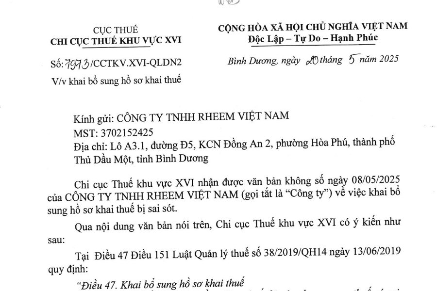 CỤC THUẾ CHI CỤC THUẾ KHU VỰC XVI Số: 7973/CCTKV.XVI-QLDN2 V/v khai bổ sung hồ sơ khai thuế CỘNG HÒA XÃ HỘI CHỦ NGHĨA VIỆT NAM Độc lập – Tự...