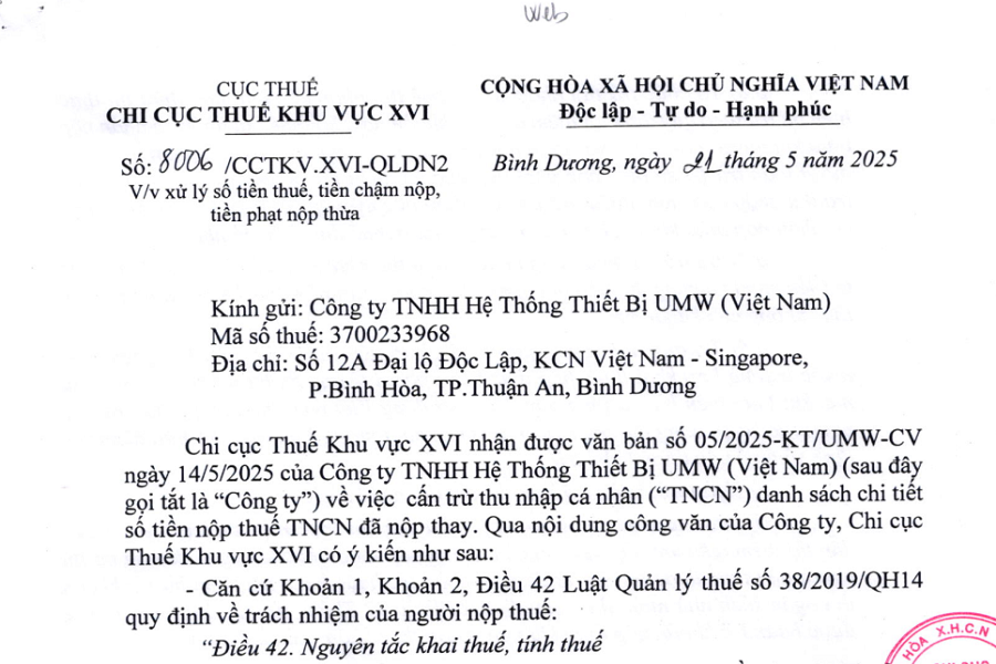 CỤC THUẾ CHI CỤC THUẾ KHU VỰC XVISố: 8006 /CCTKV.XVI-QLDN2 V/v xử lý số tiền thuế, tiền chậm nộp, tiền phạt nộp thừa CỘNG HÒA XÃ HỘI CHỦ NGHĨA...