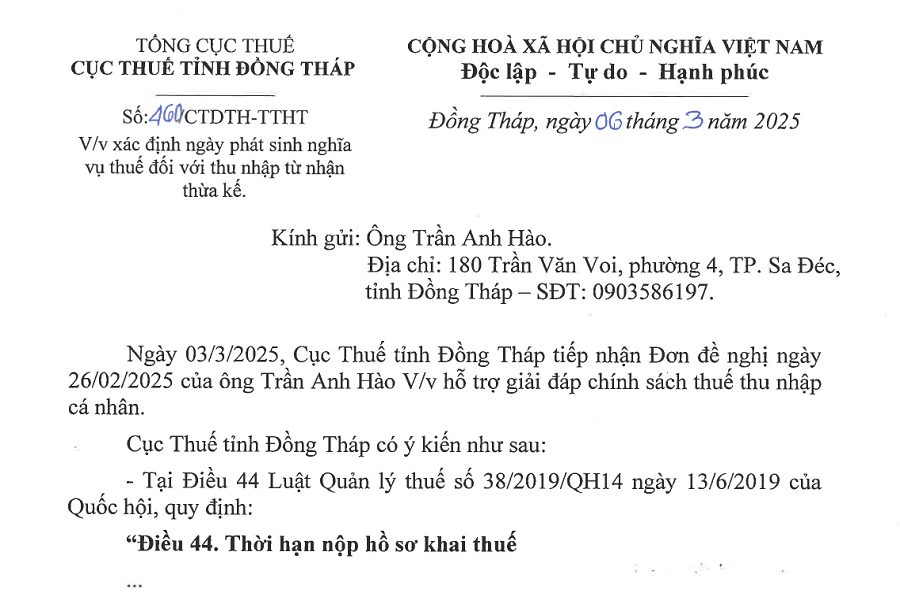 TỔNG CỤC THUẾ CỤC THUẾ TỈNH ĐỒNG THÁP Số: 460/CTDTH-TTHT V/v xác định ngày phát sinh nghĩa vụ thuế đối với thu nhập từ nhận thừa kế. CỘNG HOÀ XÃ...