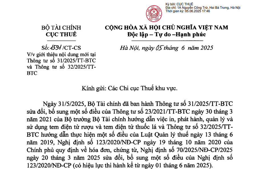 BỘ TÀI CHÍNH CỤC THUẾ ______ Số: 1591/CT-CS V/v giới thiệu nội dung mới tại Thông tư số 31/2025/TT-BTC và Thông tư số 32/2025/TT-BTC CỘNG HÒA XÃ HỘI CHỦ NGHĨA...