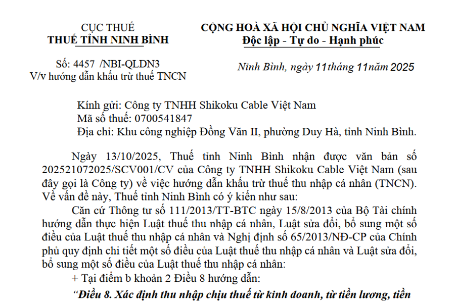 CỤC THUẾ THUẾ TỈNH NINH BÌNH Số: 4457 /NBI-QLDN3 V/v hướng dẫn khấu trừ thuế TNCN CỘNG HOÀ XÃ HỘI CHỦ NGHĨA VIỆT NAM Độc lập – Tự do –...