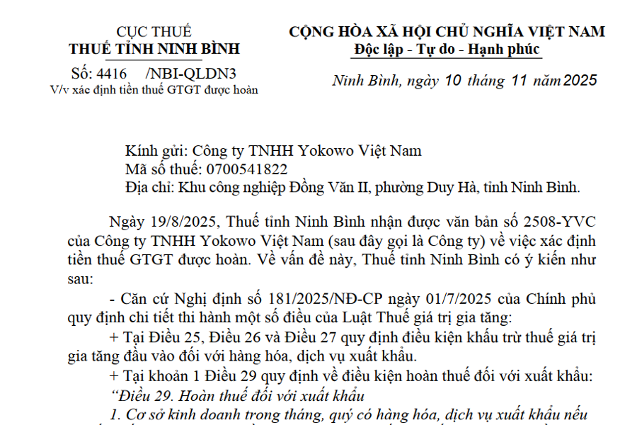 CỤC THUẾ THUẾ TỈNH NINH BÌNH Số: 4416 /NBI-QLDN3 V/v xác định tiền thuế GTGT được hoàn CỘNG HOÀ XÃ HỘI CHỦ NGHĨA VIỆT NAM Độc lập – Tự do...