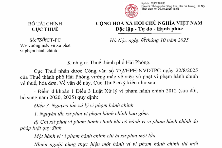 Công văn 4287 về việc không giới hạn số tiền phạt hành chính về hóa đơn