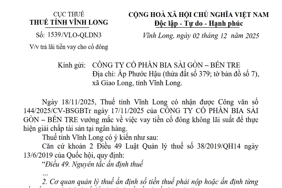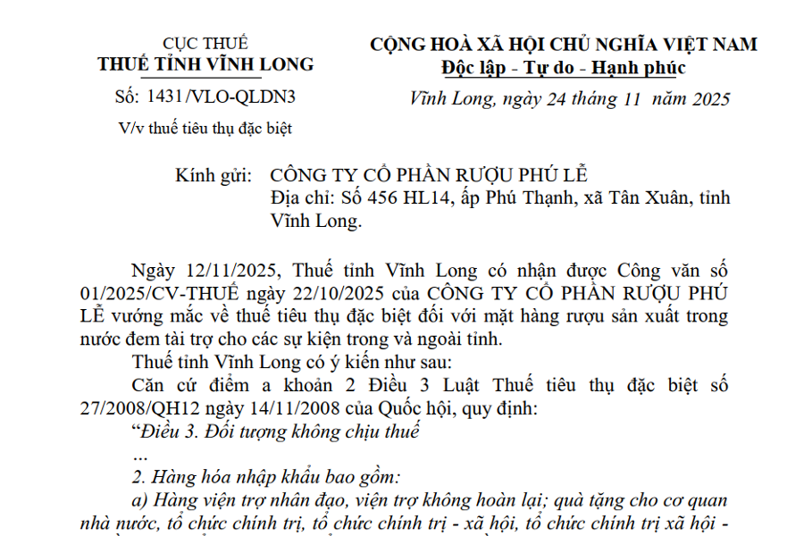 CỤC THUẾ THUẾ TỈNH VĨNH LONG CỘNG HOÀ XÃ HỘI CHỦ NGHĨA VIỆT NAM Độc lập – Tự do – Hạnh phúc Số: 1431/VLO-QLDN3 V/v thuế tiêu thụ đặc biệt...