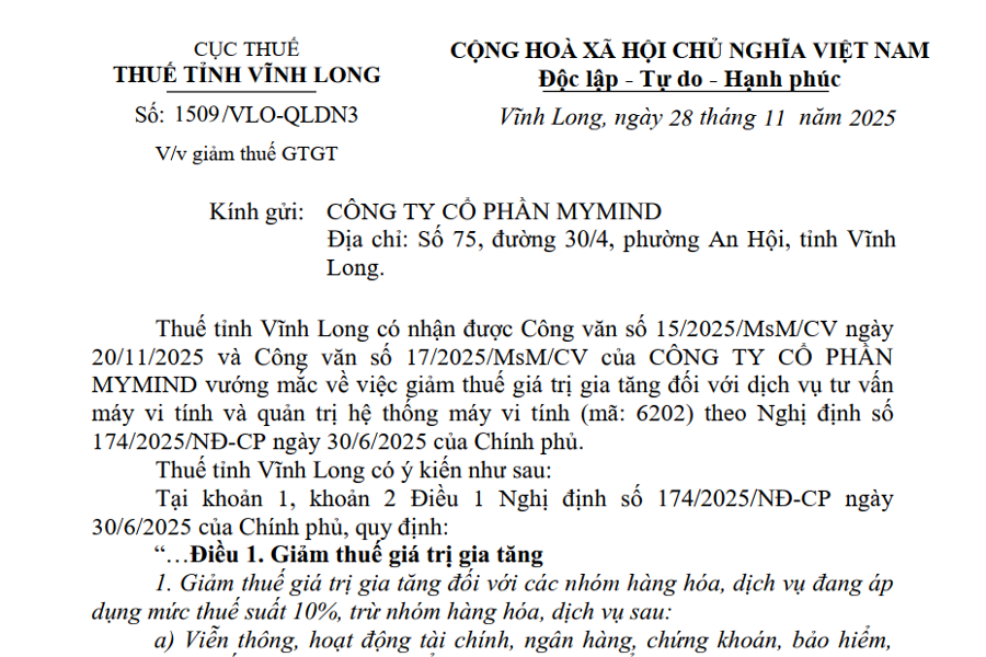 CỤC THUẾ THUẾ TỈNH VĨNH LONG CỘNG HOÀ XÃ HỘI CHỦ NGHĨA VIỆT NAM Độc lập – Tự do – Hạnh phúc Số: 1509/VLO-QLDN3 V/v giảm thuế GTGT Vĩnh Long,...