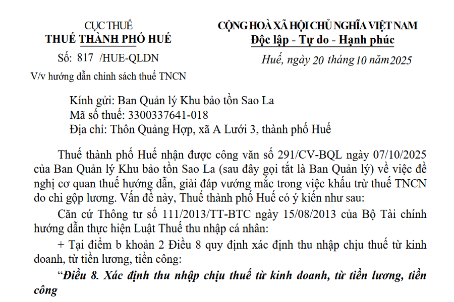 Công văn 817 hướng dẫn kê khai thuế TNCN theo thời điểm thực chi trả