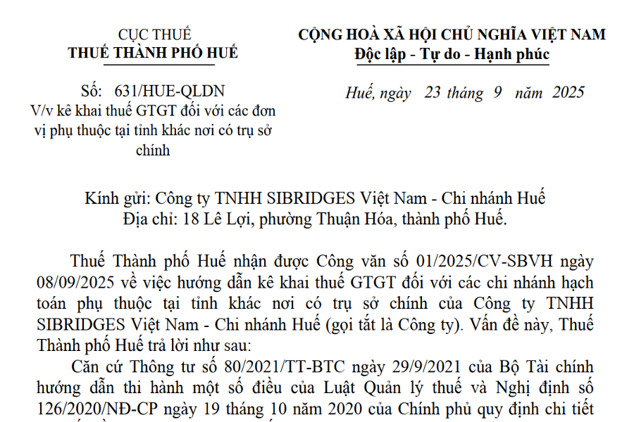 Công văn 632 hướng dẫn kê khai thuế GTGT đối với chi nhánh phụ thuộc