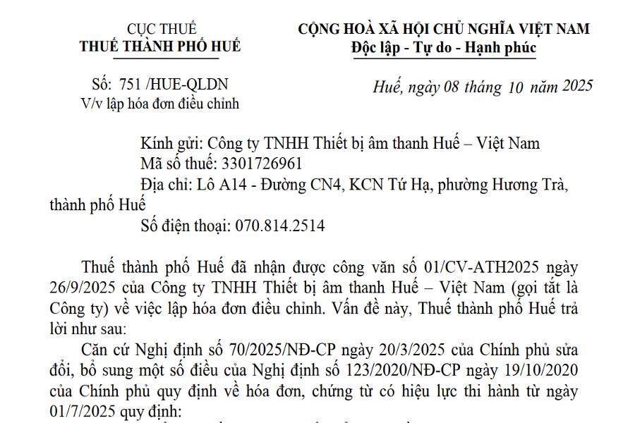 CỤC THUẾ THUẾ THÀNH PHỐ HUẾ Số: 751 /HUE-QLDN V/v lập hóa đơn điều chỉnh CỘNG HOÀ XÃ HỘI CHỦ NGHĨA VIỆT NAM Độc lập – Tự do – Hạnh...