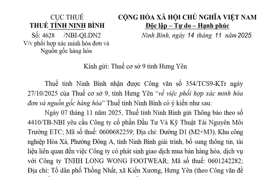 CỤC THUẾ THUẾ TỈNH NINH BÌNH Số: 4628 /NBI-QLDN2 V/v phối hợp xác minh hóa đơn và Nguồn gốc hàng hóa CỘNG HÒA XÃ HỘI CHỦ NGHĨA VIỆT NAM Độc...