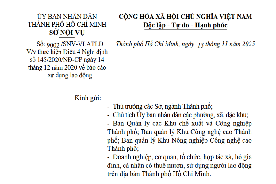 ỦY BAN NHÂN DÂN THÀNH PHỐ HỒ CHÍ MINH SỞ NỘI VỤ Số: 9002 /SNV-VLATLĐ V/v thực hiện Điều 4 Nghị định số 145/2020/NĐ-CP ngày 14 tháng 12 năm 2020...