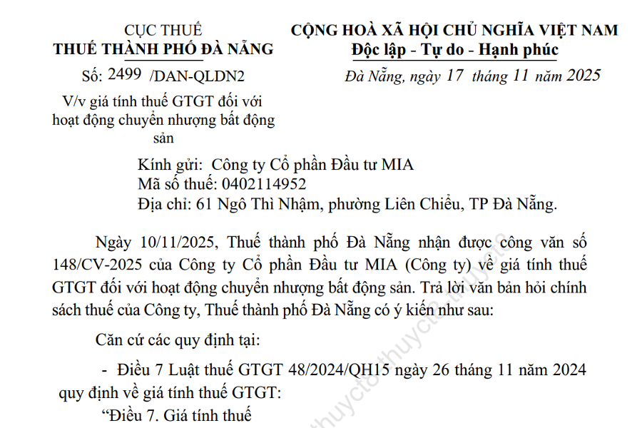 Công văn 2499 hướng dẫn giá tính thuế GTGT hoạt động chuyển nhượng bất động sản