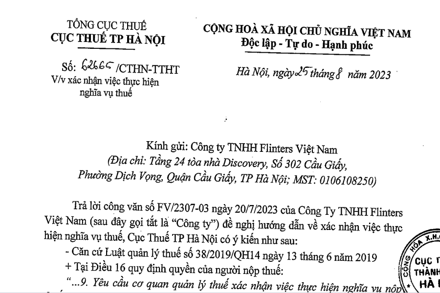 TỔNG CỤC THUẾ CỤC THUẾ TP HÀ NỘI ——- CỘNG HÒA XÃ HỘI CHỦ NGHĨA VIỆT NAM Độc lập – Tự do – Hạnh phúc ————— Số: 62665/CTHN-TTHT V/v xác nhận...
